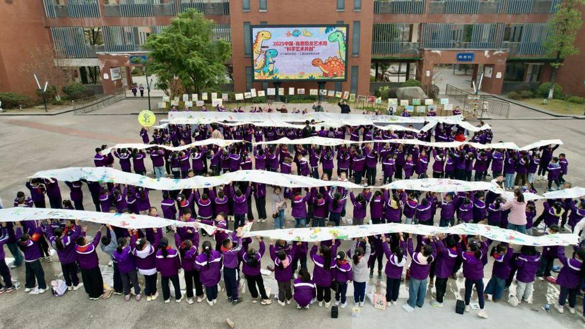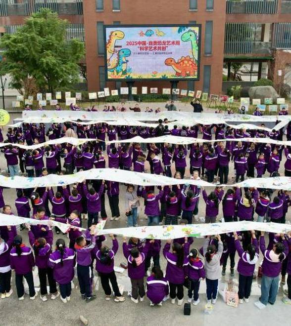 “万人画恐龙”在自贡8校开展,千名中小学生手绘“侏罗纪长卷”:有写实派、也有抽象派