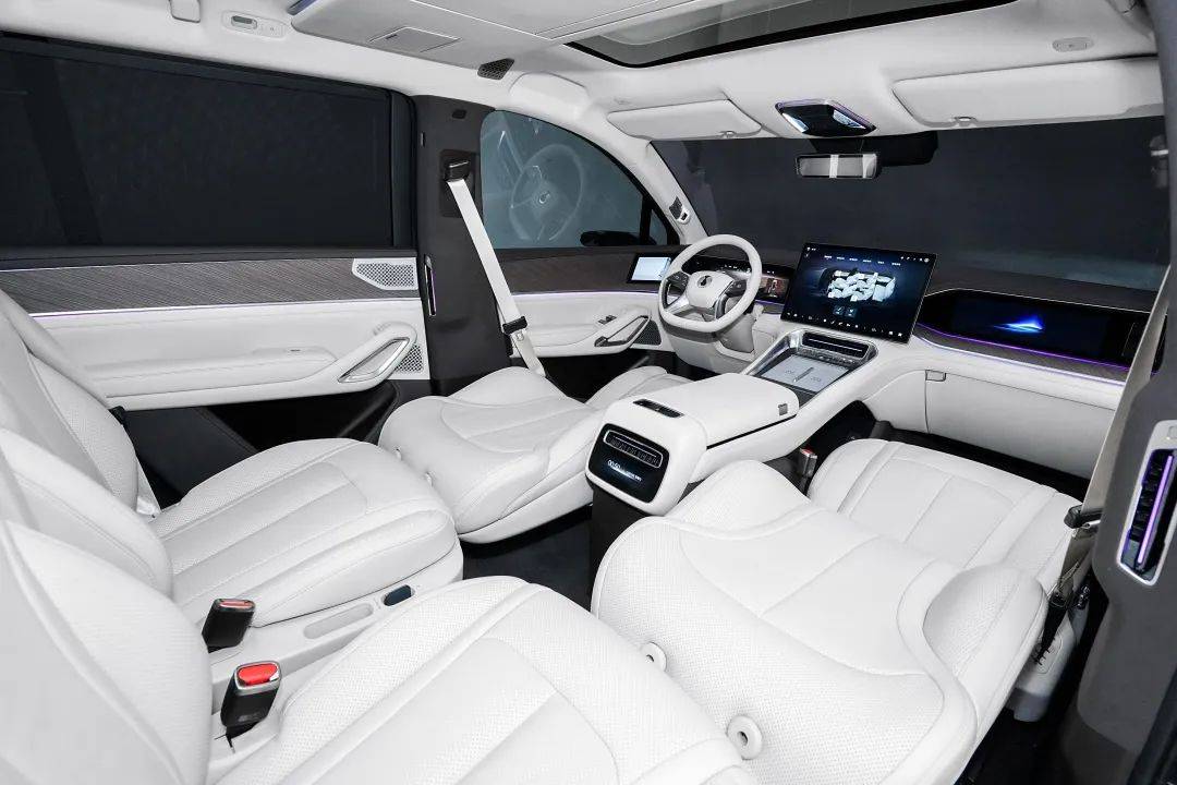 第二排布置有双独立座椅,带有14向电动调节、左右横移联动调节、电动双腿托(4向调节)、双桌板、双50瓦手机无线充电。二三排座椅也可以放平形成一张床,在放平的时候,第三排椅垫还能升至水平位置。