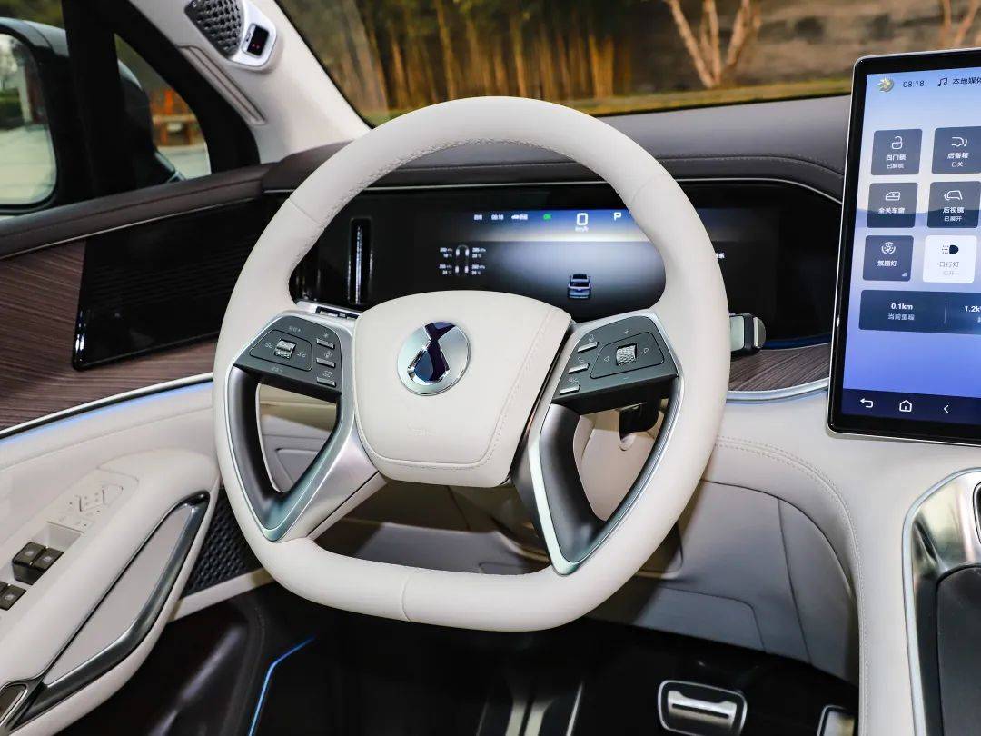内饰方面,腾势N9中控台采用对称式布局,在悬浮式布置的17.3英寸中控屏两侧为嵌入式的双13.2英寸液晶仪表盘和副驾驶娱乐信息屏。由于采用怀挡式换挡方式,腾势N9副仪表台区域空间有所释放,并设计有双手机无线充电面板,最大充电功率为50瓦,尽管大部分功能控制可通过中控屏进行操作,但副仪表台区域仍保留有单排物理按键。方向盘为四辐式造型,具有电动调节功能,并使用按键和滚轮组合的实体按键,部分功能使用中文标注。