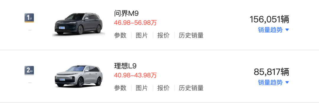 腾势N9是腾势品牌焕新后推出的第五款新车(腾势D9、腾势N7、腾势N8、腾势Z9/Z9 GT),根据车型定位以及动力来看,腾势N9现阶段的主要竞争对手为理想L9(指导价40.98万-43.98万元)、问界M9(指导价46.98万-56.98万元)两款车型,后续还将会包括已经亮相的领克900。零售数据显示,2024年问界M9销量为15.61万辆,理想L9为8.58万辆。