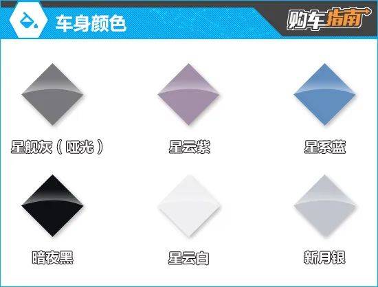 车身颜色方面,新车提供了六种配色可选。其中,星舰灰(哑光)颜色比较特殊,只有星舰版标配,并且该版本车型只可选择这一种车身涂装。而其他版本车型想要获得星舰灰(哑光)配色,则需要花费8000元选装。