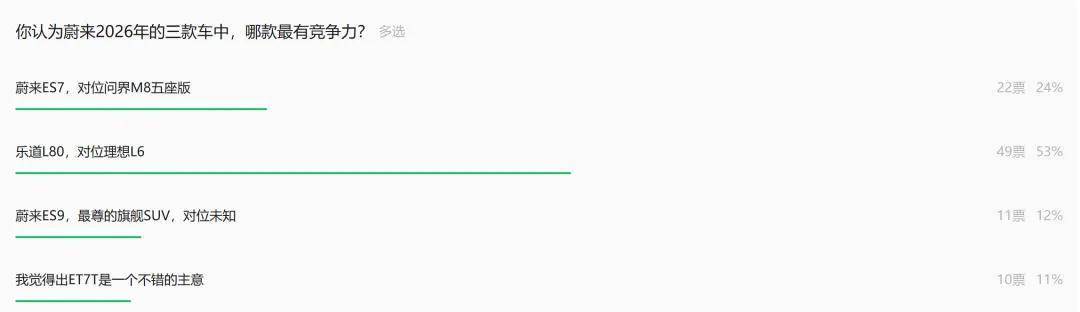 大部分人看好乐道L80,但我估计再来一次投票,可能ES7的得票率会更高,同时ES9也会获得更高的期待。